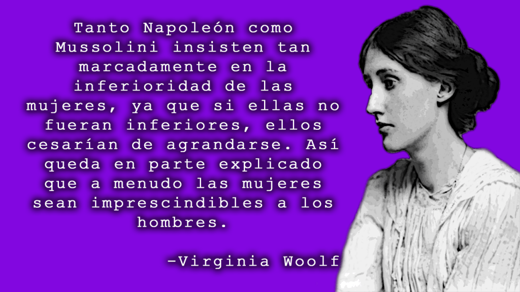 Por eso, tanto Napoleón como Mussolini insisten tan marcadamente en la inferioridad de las mujeres, ya que si ellas no fueran inferiores, ellos cesarían de agrandarse. Así queda en parte explicado que a menudo las mujeres sean imprescindibles a los hombres. Y también así se entiende mejor por qué a los hombres les intranquilizan tanto las críticas de las mujeres; por qué las mujeres no les pueden decir este libro es malo, este cuadro es flojo o lo que sea sin causar mucho más dolor y provocar mucha más cólera de los que causaría y provocaría un hombre que hiciera la misma crítica. Porque si ellas se ponen a decir la verdad, la imagen del espejo se encoge; la robustez del hombre ante la vida disminuye. ¿Cómo va a emitir juicios, civilizar indígenas, hacer leyes, escribir libros, vestirse de etiqueta y hacer discursos en los banquetes si a la hora del desayuno y de la cena no puede verse a sí mismo por lo menos de tamaño doble de lo que es?