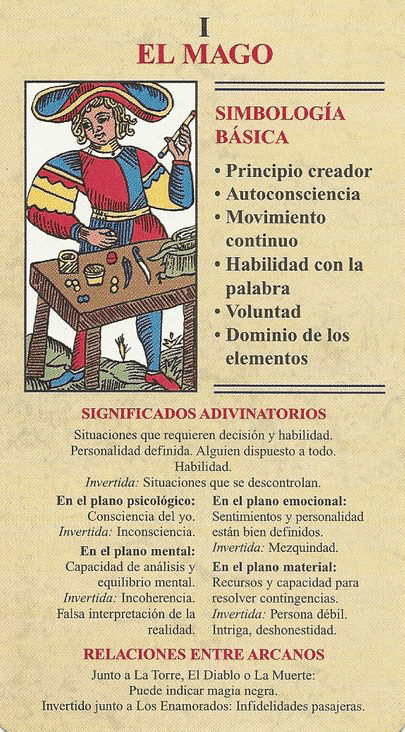 En la carta El Mago, somos testigos de una figura de pie confiadamente con una mano apuntando hacia arriba y la otra hacia abajo. Este gesto conecta el reino espiritual de arriba con el mundo material de abajo, simbolizando el puente entre los cielos y la tierra. Las herramientas del mago, como la varita, la copa, la espada y el pentáculo, representan los cuatro elementos y sus reinos correspondientes. El es un manipulador de los elementos para crear la realidad que quiere.