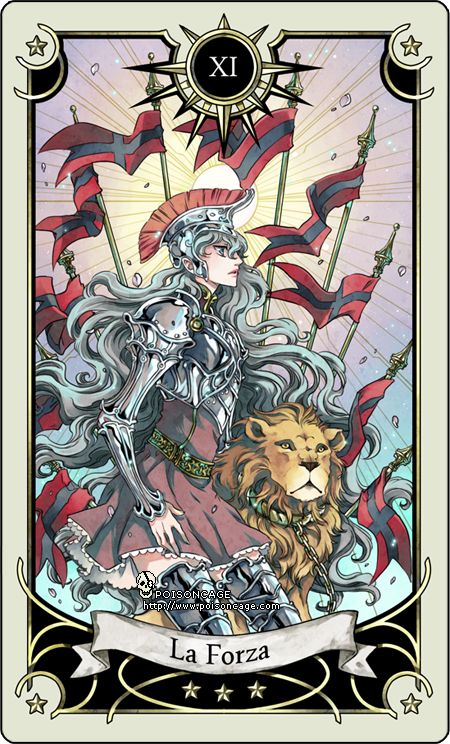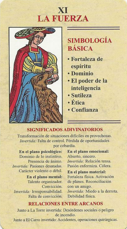 La carta de Fuerza suele representar a una mujer cerrando suave pero firmemente las fauces de un poderoso león. Estas imágenes resumen la esencia de la fuerza interior y el coraje. La mujer representa el espíritu humano, mientras que el león simboliza nuestra naturaleza primitiva e instintiva. El acto de someter al león con gracia y compasión resalta la idea de que la verdadera fuerza no se manifiesta a través de la fuerza bruta sino a través de la domesticación de nuestras bestias interiores.