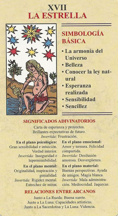 La presencia de la mujer cerca del agua significa purificación, renovación y curación emocional. Las imágenes generales de la carta transmiten la idea de recibir inspiración y guía divina del cosmos.