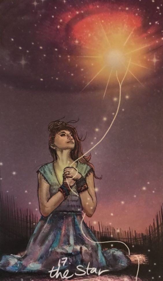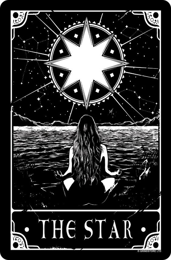 La carta de la Estrella suele representar una figura serena y desnuda, a menudo una mujer, arrodillada al borde de un estanque o un arroyo. Vierte agua de dos jarras, lo que simboliza el flujo de inspiración y la fusión de los reinos consciente e inconsciente. Sobre ella, brilla un dosel de estrellas, que representan la sabiduría y la guía cósmicas.
