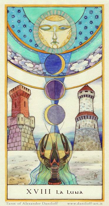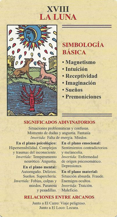 La carta de la Luna suele representar una escena serena iluminada por la luna con un camino que conduce hacia dos torres o pilares. En el camino hay un perro y un lobo, que a menudo representan la mente consciente y subconsciente. Un cangrejo de río emerge de un estanque, simbolizando las profundidades del inconsciente.