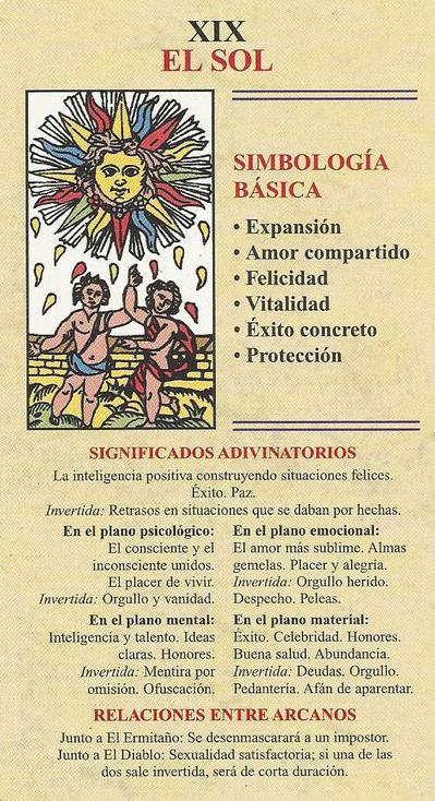 La carta del Sol suele representar un sol radiante en el cielo, a menudo con un niño a caballo debajo. La imagen es de pura alegría y vitalidad, con girasoles en plena floración, lo que significa abundancia y crecimiento. El niño simboliza la inocencia y la expresión desinhibida del verdadero yo.