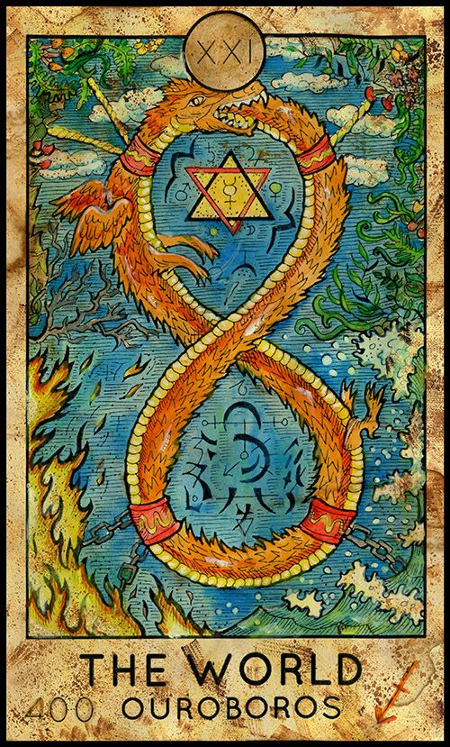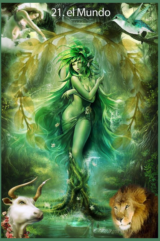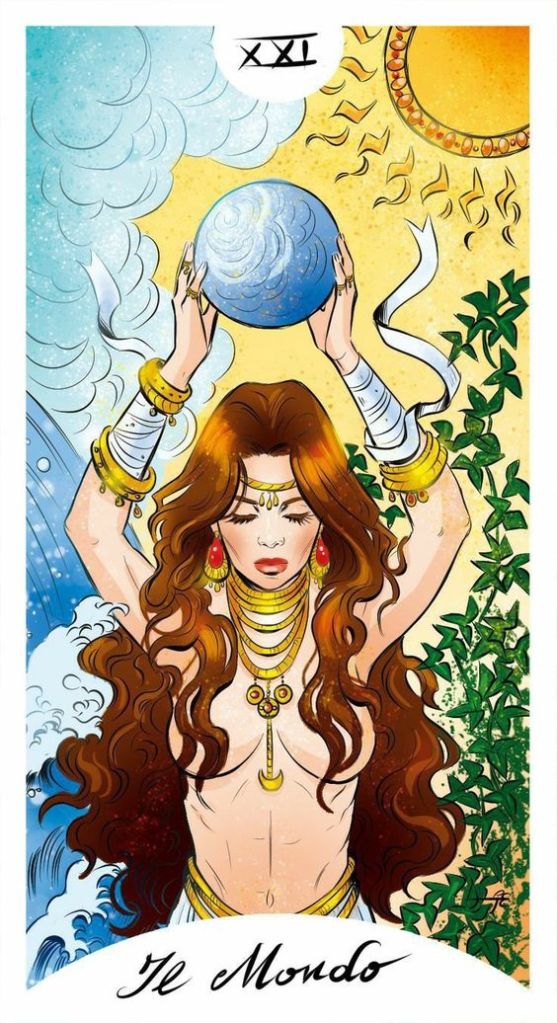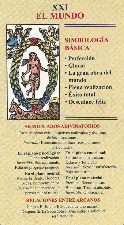 La figura central representa la unidad y la plenitud cósmica, y la corona o cinturón significa el ciclo infinito de la vida. La carta del Mundo incita a los buscadores a reconocer la culminación de una fase importante en el viaje de su vida y a prepararse para el nuevo comienzo que sigue.