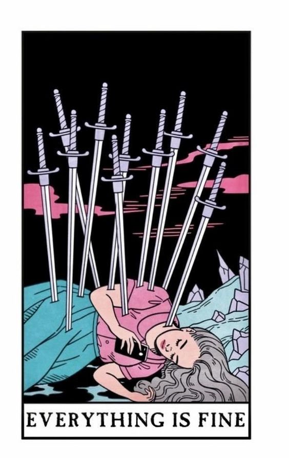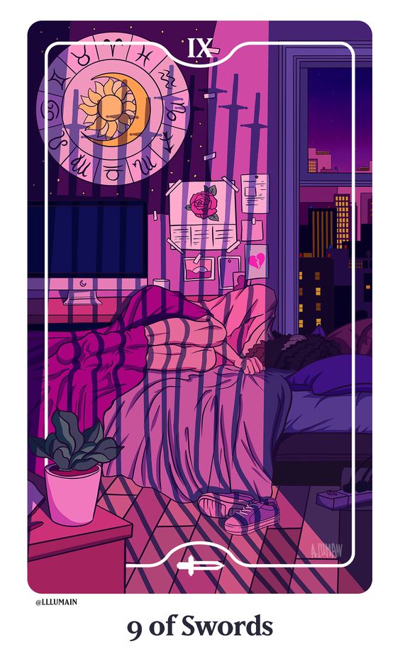 La ansiedad, la preocupación y la agitación interior definen al Nueve de Espadas. Representa noches de insomnio, estrés y angustia mental, a menudo causadas por una preocupación excesiva o miedo a lo desconocido.