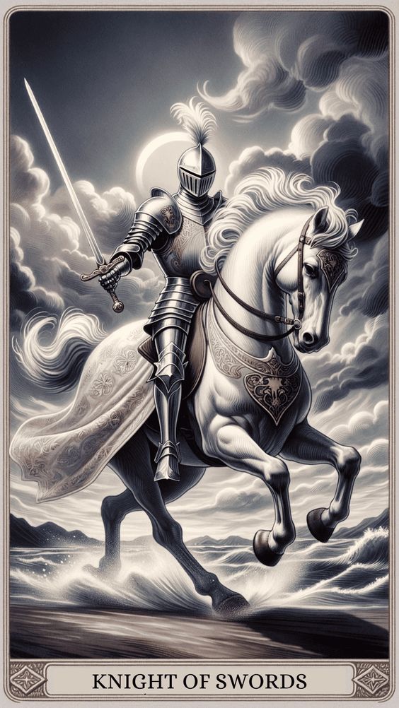 Acción, ambición y asertividad caracterizan al Caballero de Espadas. Significa avanzar, buscar la verdad y una búsqueda incesante de objetivos a través de determinación y decisión.