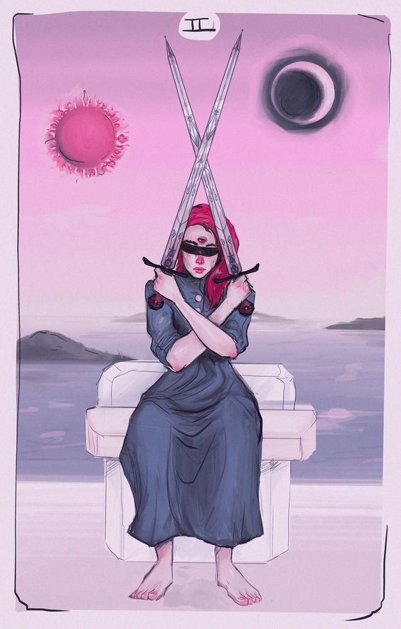 En el Dos de Espadas, hay una representación de una figura con los ojos vendados y sosteniendo dos espadas cruzadas, simbolizando la necesidad de tomar una decisión. Refleja elecciones, dilemas y la necesidad de equilibrio entre ideas o situaciones opuestas.