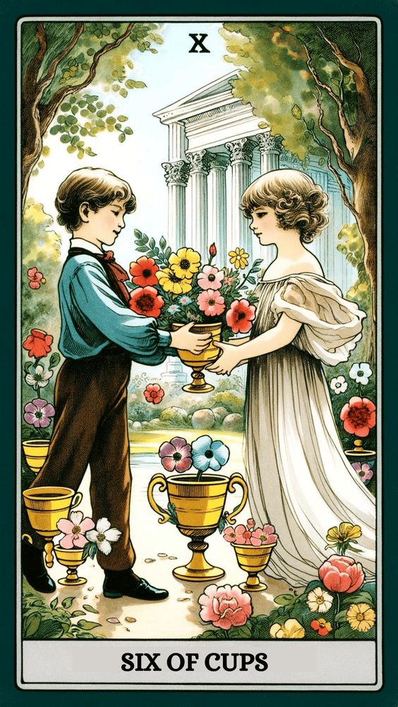 La nostalgia, la inocencia y la generosidad están encarnadas en el seis de copas. Significa revisar el pasado, los recuerdos de la infancia y ofrecer o recibir apoyo emocional y bondad.