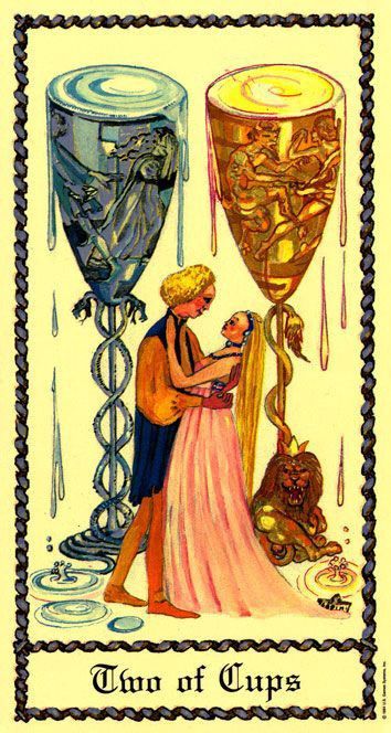 El dos de copas encarna la unidad, acuerdos, pactos, la asociación y la atracción mutua. Significa el comienzo de una relación significativa, armonía y equilibrio emocional entre dos personas.