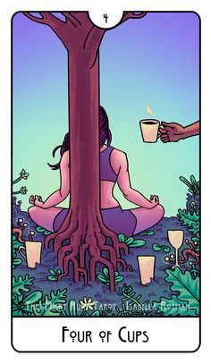 El cuatro de copas simboliza la contemplación, la introspección y la necesidad de reevaluación emocional. Sugiere un período de descontento o apatía, lo que provoca una reflexión sobre los estados emocionales existentes. Sugiere aburrimiento en relaciones.