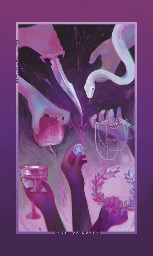 El siete de copas representa elecciones, fantasías e imaginación. A menudo representa una figura que contempla múltiples opciones o sueños, instando a tener precaución para no verse abrumado por expectativas o ilusiones poco realistas.