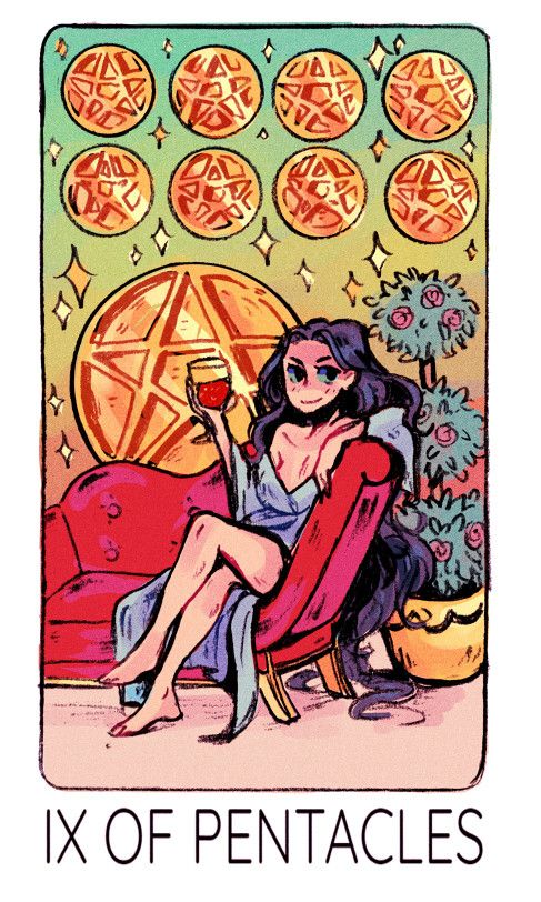 El Nueve de Oros simboliza la autosuficiencia, el lujo y el bienestar material. Representa disfrutar de los frutos del trabajo, la independencia y una sensación de logro en los logros personales.