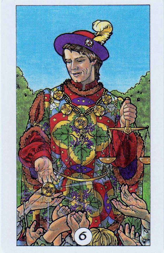La generosidad, la caridad y la abundancia compartida caracterizan al Seis de Oros. Significa dar y recibir ayuda, equilibrar los recursos materiales y la importancia de la justicia en las interacciones. Significa nuevas ayudas financieras, aunque no significa que no habrá trabajo por ello.