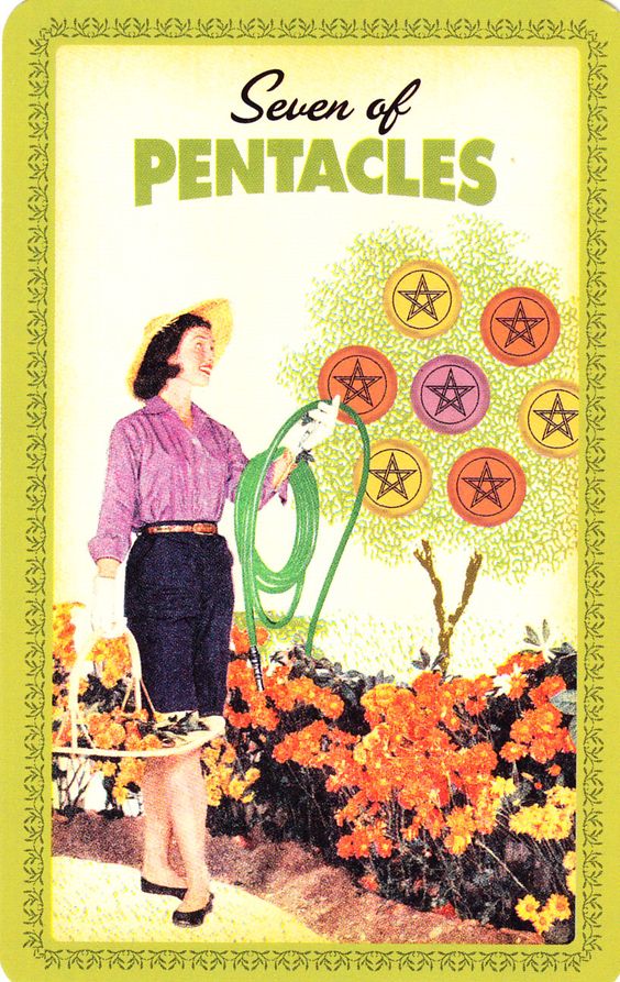 El Siete de Oros representa evaluación, paciencia y planificación a largo plazo. Significa un período de evaluación, espera de resultados y cosecha de recompensas de inversiones o esfuerzos anteriores.