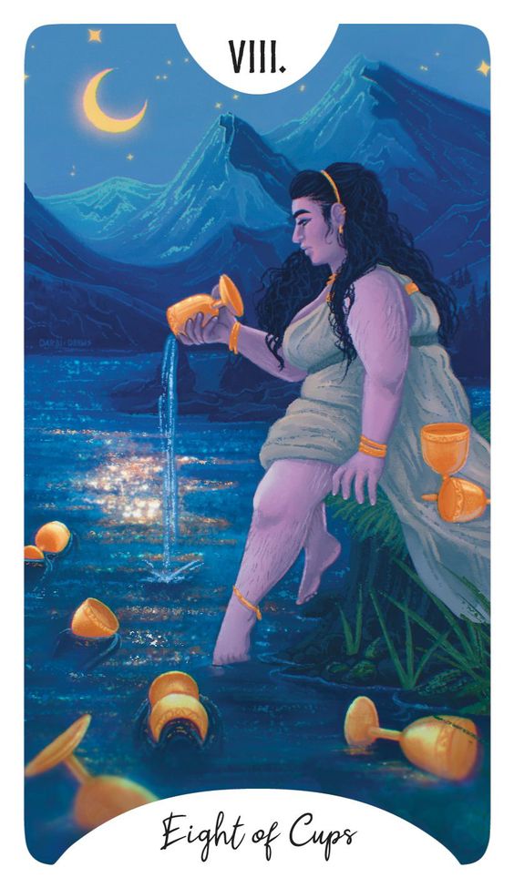 El hombre del Ocho de Copas intenta escabullirse en plena noche para evitar llamar la atención. A menudo veo esta carta como una señal de que alguien está intentando hacer un acto de desaparición, con la esperanza de evitar las consecuencias de sus acciones.