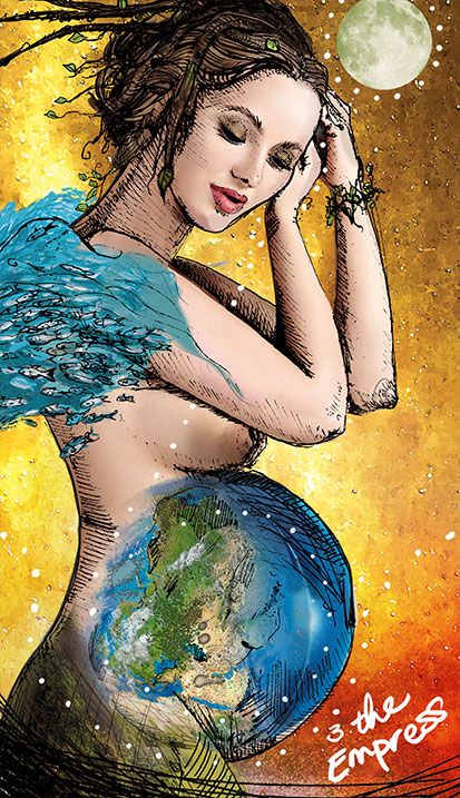 La Emperatriz es madre. Y muchas barajas la representan como embarazada o al menos como madre. Definitivamente está conectada a la tierra. Pero originalmente, esta conexión se debía principalmente a su pragmatismo y comprensión del mundo material. Ella es el otro lado de la Suma Sacerdotisa, la que gobierna lo tangible.